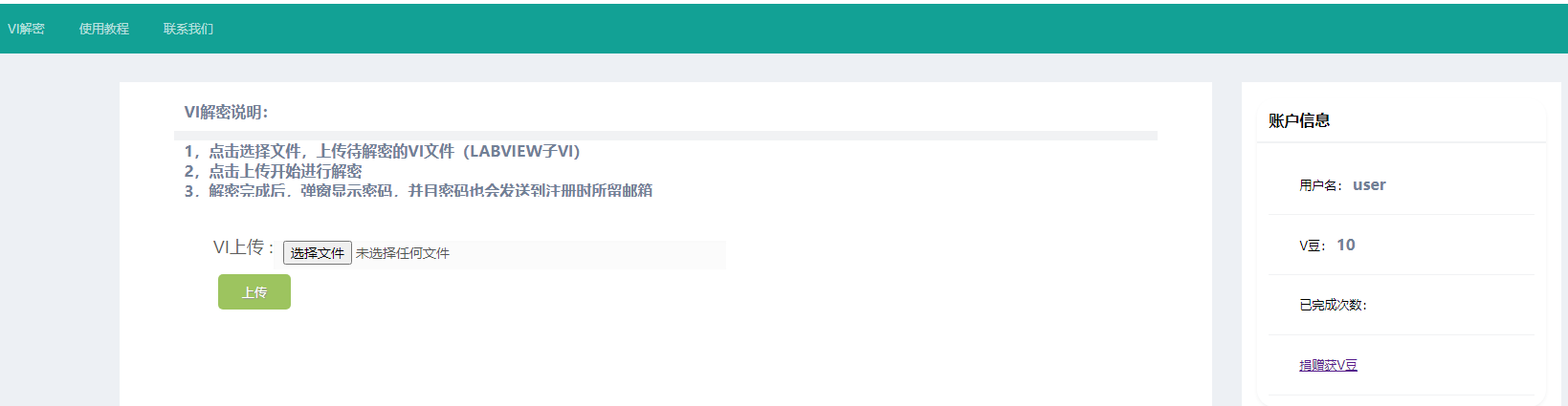 2,登录完成后会出现如下界面,右侧栏会显示用户名,V豆数目以及解密次数